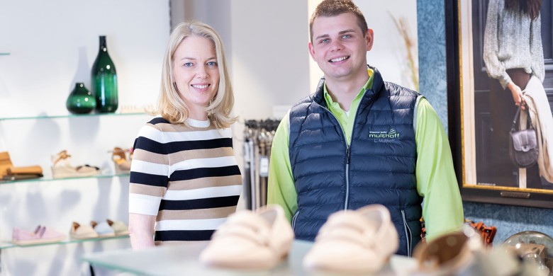 Schuhhändlerin Karin Bittner arbeitet mit einem Orthopädietechniker